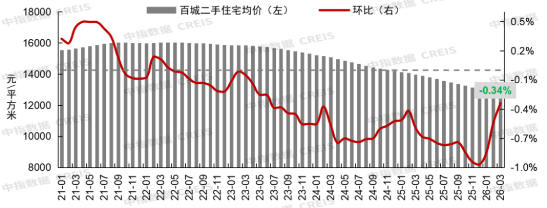 3月份,百城二手住宅平均价格环比下跌0.34%,同比下跌8.55%。